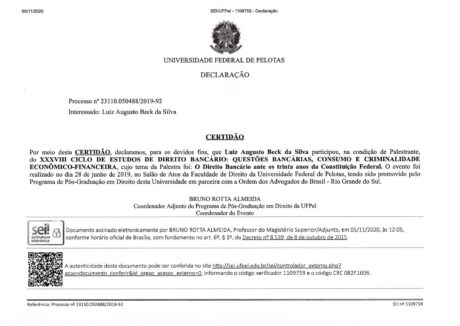 42. Palestra em 28/6, das 18h30min às 20h00min na Universidade Federal de Pelotas – UFPEL com lançamento do livro O Direito Bancário ante os 30 anos da Constituição Federal, Editora Livraria do Advogado, e sessão de autógrafos. Tema: Constituição Federal. Direito Bancário. Avanços e Retrocessos.
