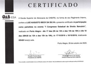 15. Em 24/11/2010 – Palestra proferida junto à ESA – Escola Superior de Advocacia – OAB/RS, das 19h00min às 21h00min. Tema: Mudanças do Novo Código Civil com repercussão nas operações bancárias.